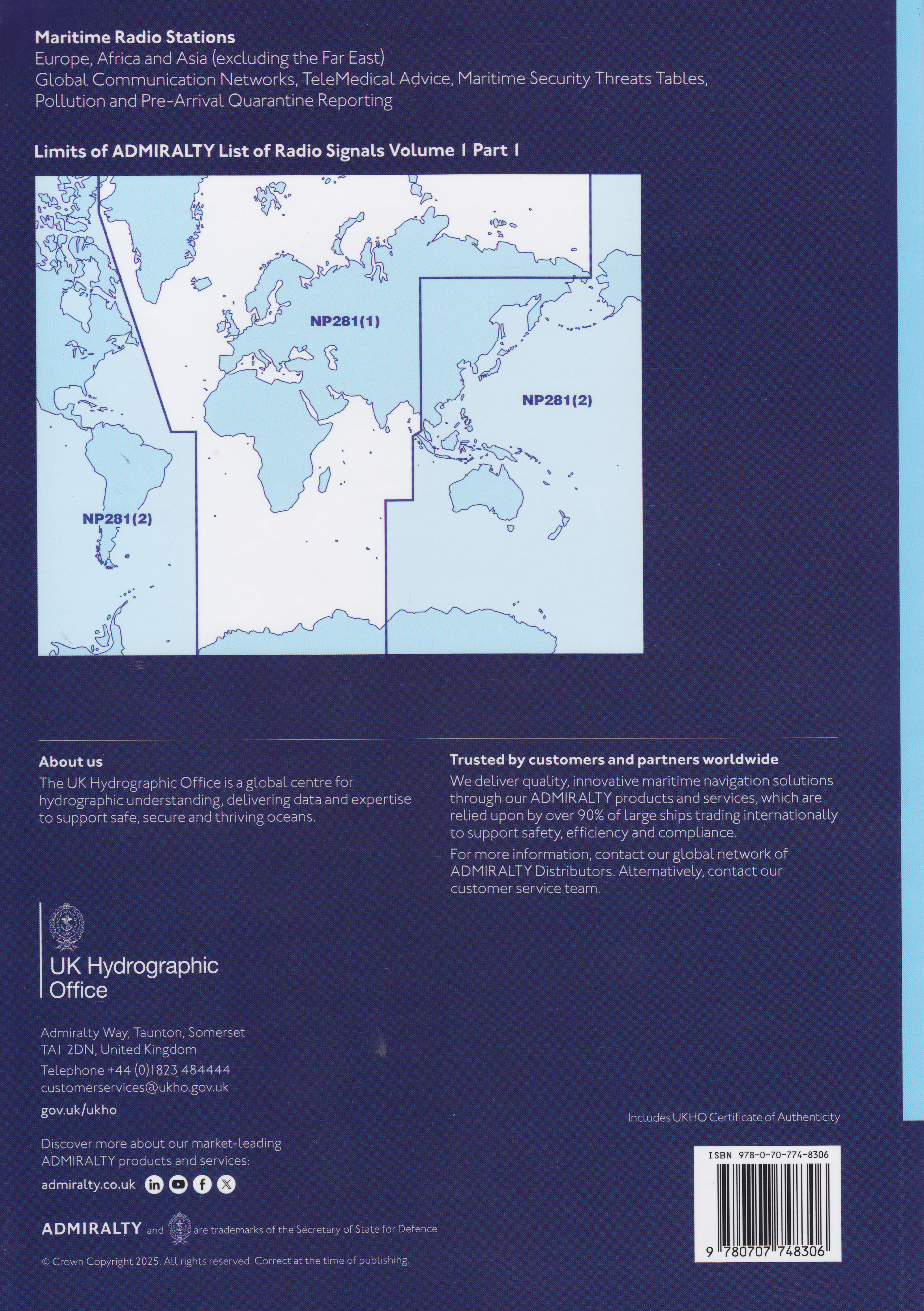 NP 281(1) 2025 Edition Admiralty List of Radio Signals Vol. I Ρωτήστε τιμή ISBN 978-0-70-774-8306 Maritime Radio Stations Κατηγορίες: The United Kingdom Hydrographic Office, Αγγλικές Ναυτιλιακές Εκδόσεις, Εκδόσεις British Admiralty, Νέες Εκδόσεις Περιγραφή Επιπλέον πληροφορίες Περιγραφή Europe, Africa and Asia (excluding the Far East) Επιπλέον πληροφορίες Βάρος 1,186 κ. Σχετικά προϊόντα Αγγλικές Ναυτιλιακές Εκδόσεις Greek Waters Pilot Διαβάστε περισσότερα Αγγλικές Ναυτιλιακές Εκδόσεις 2000 HSC Code – International Code of Safety for High-Speed Craft Διαβάστε περισσότερα Αγγλικές Ναυτιλιακές Εκδόσεις NP283(1) 2025 Edition – Admiralty List of Radio Signals Vol. 3 Part I Διαβάστε περισσότερα